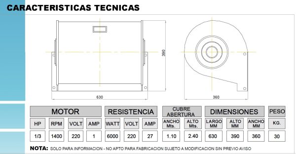 Dimensiones (mm): Ancho: 630 Altura: 390 Profundidad: 360